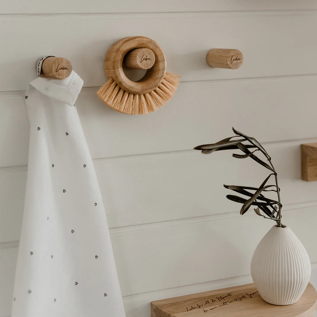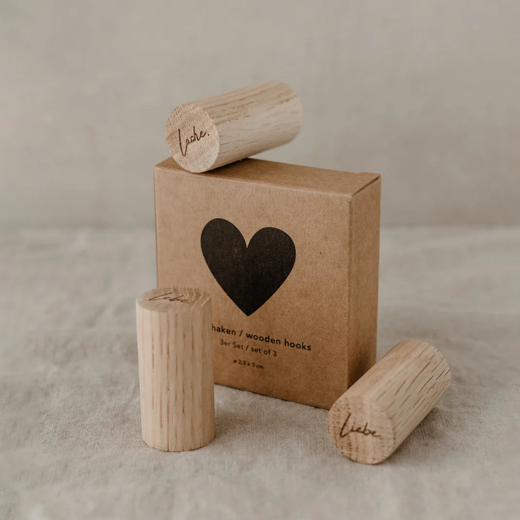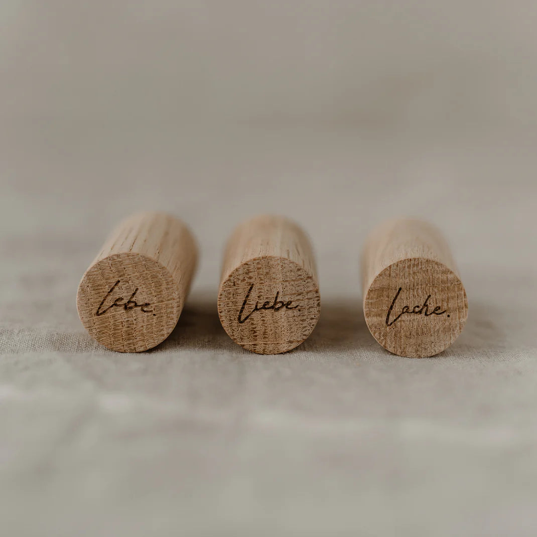 Die Eichenholz-Wandhaken Lebe, Liebe & Lache bringen Wärme und Freude in dein Zuhause.