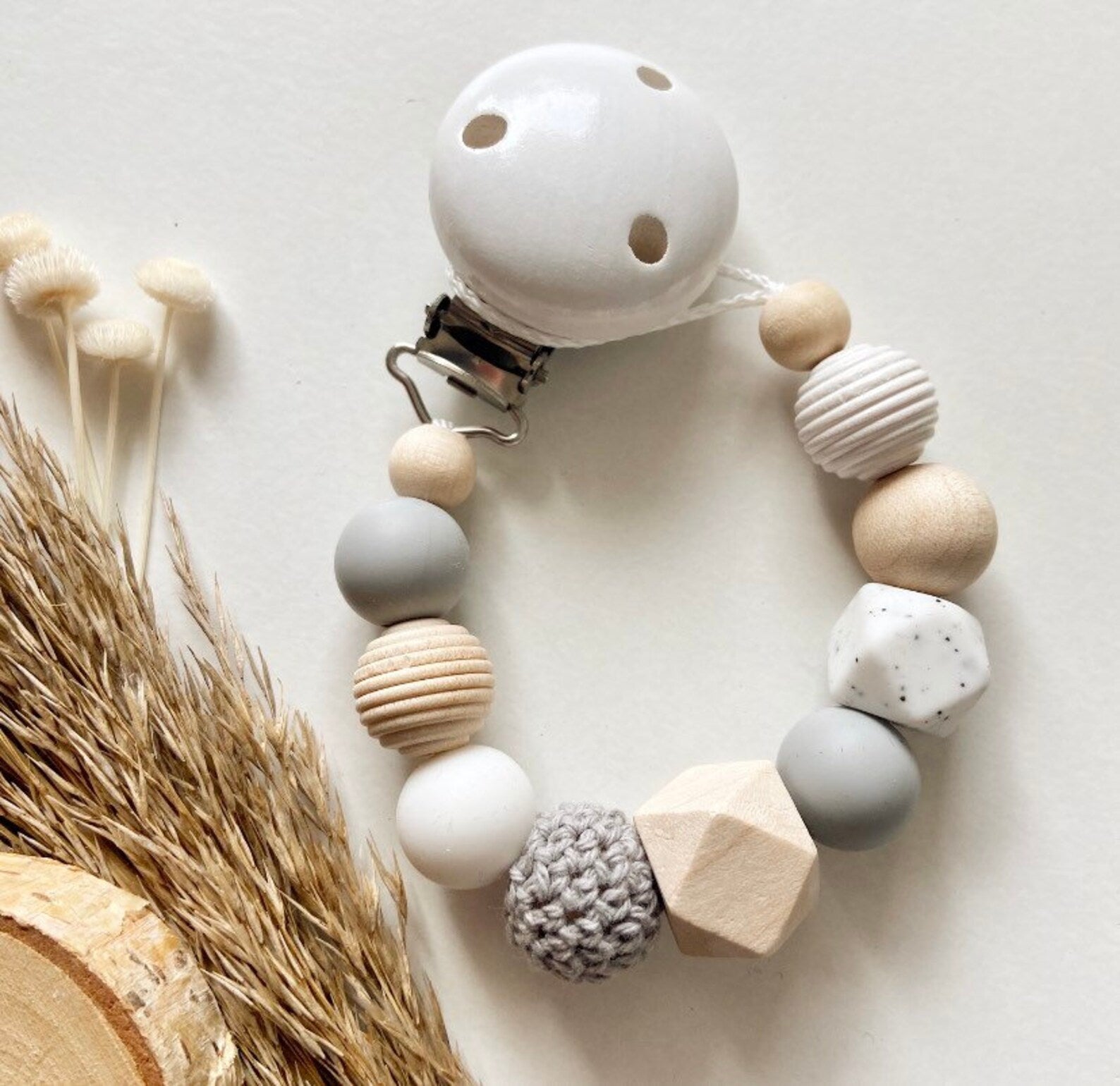 Ich biete hier mit viel Liebe selbstgemachte Schnullerketten mit Namen für Mädchen und Jungs in stilvollen Naturtönen an - Modell Hexagon.