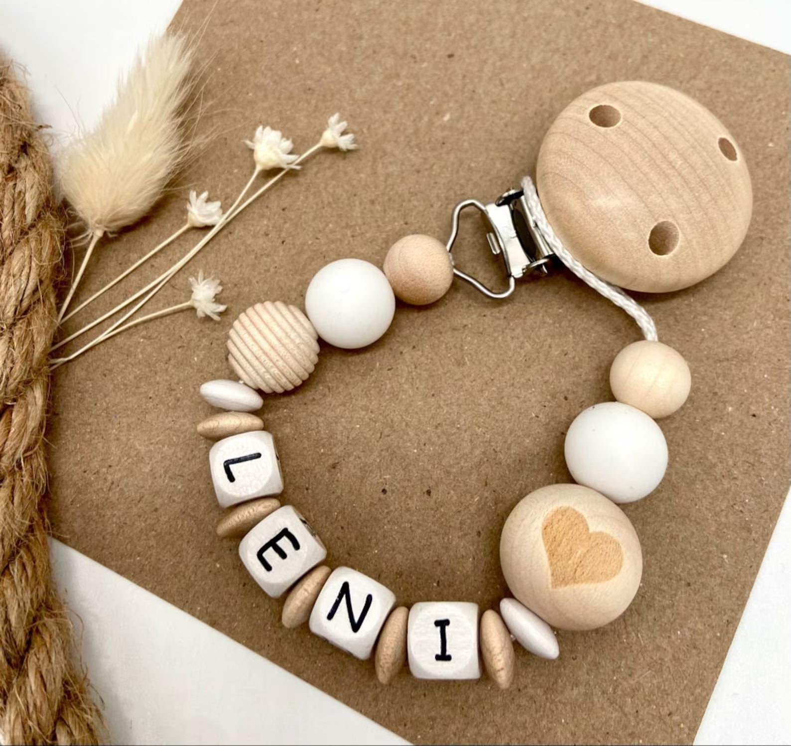 Ich biete hier mit viel Liebe selbstgemachte Schnullerketten mit Namen für Mädchen und Jungs in stilvollen Naturtönen an - Modell Holzherz.