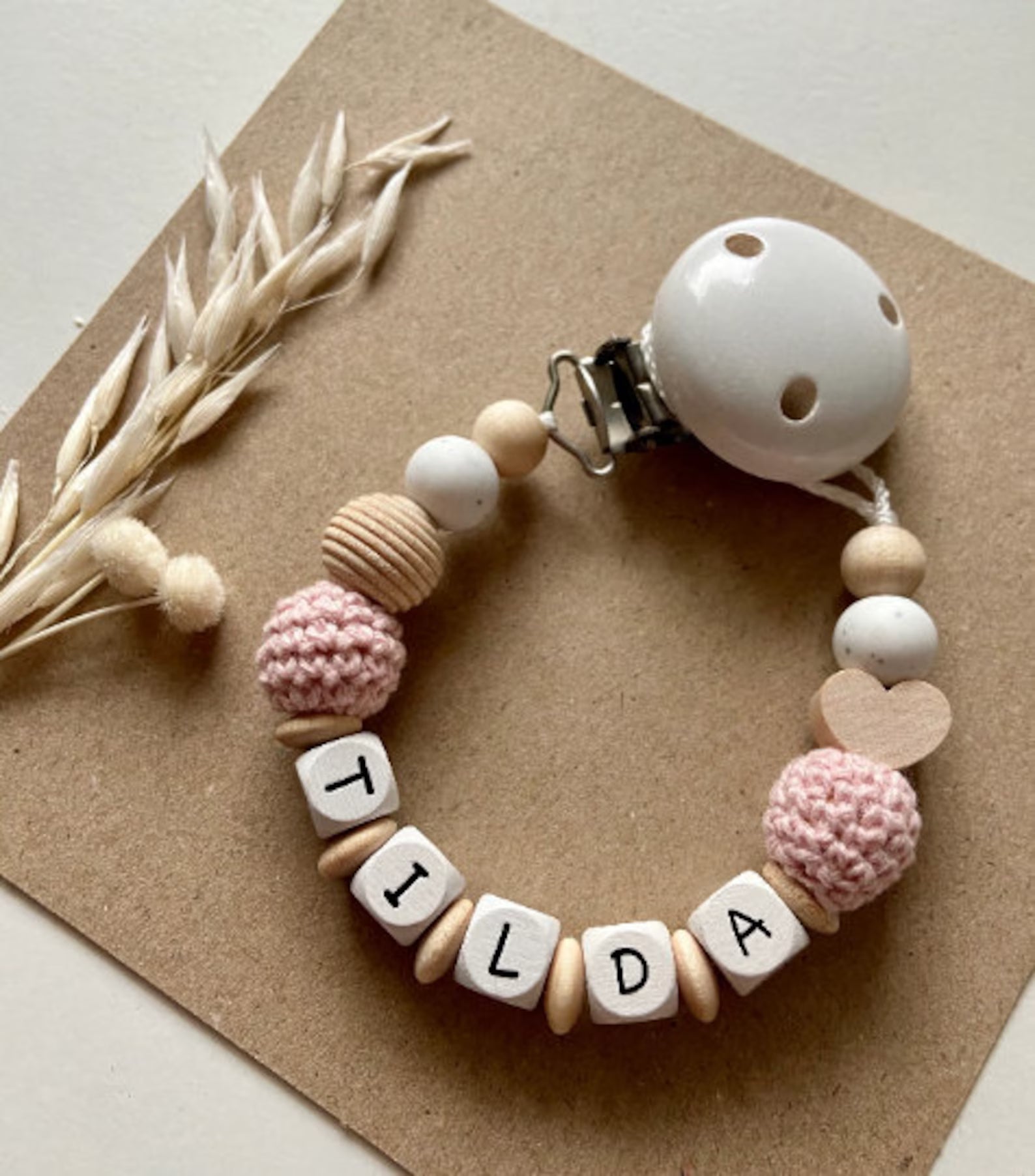 Ich biete hier mit viel Liebe selbstgemachte Schnullerketten mit Namen für Mädchen und Jungs in stilvollen Naturtönen an - Modell Rosa.